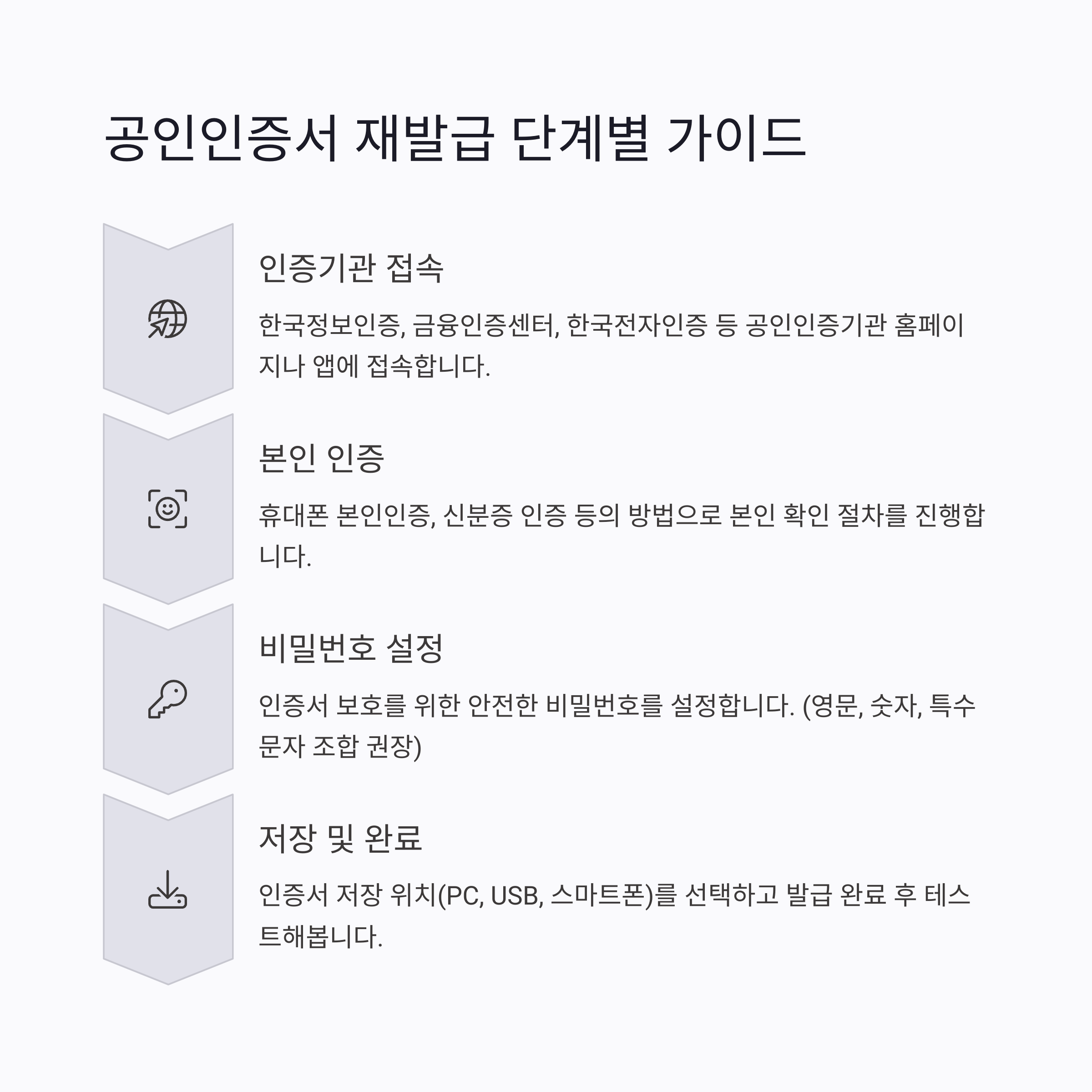 | 공인인증서 재발급이란? | 기존 인증서를 분실했거나 만료되었을 때 새로 발급받는 절차입니다. |