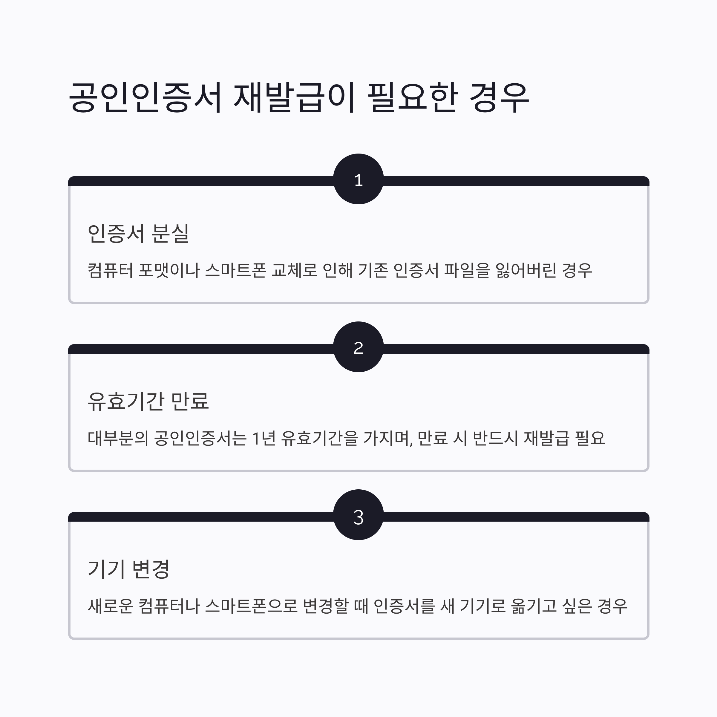 | 어떤 상황에서 필요할까? | 인증서 분실, 기간 만료, PC 포맷 후 등 다양한 경우에 재발급이 필요합니다. |